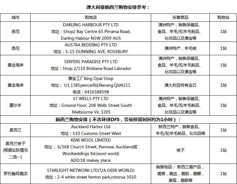 行程中会安排7-8购物店(以上店名、地址仅供参考,详细请以最终行程为准),请理性消费,保留相关购物凭证。购物店不强制购物,但请您配合随团进出。退货要求: 1、必须保证货品完整无损,退货时出示购物发票。2、刷卡购买货品时产生的手续费用由客人承担。3、由于货物并非我司出售,我司会协调商家进行退货,具体货物退换处理还需客人自行邮寄至商家,敬请谅解。